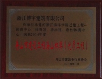 浙江海洋学院迁建工程—体育中心工程荣获舟山市“海山杯”优质工程,是对博宇建筑公司在科技创新方面的充分肯定,更是博宇建筑公司注重工程质量,追求卓越的结果,为公司在建筑市场做强、做大、做精打下了良好的基础。